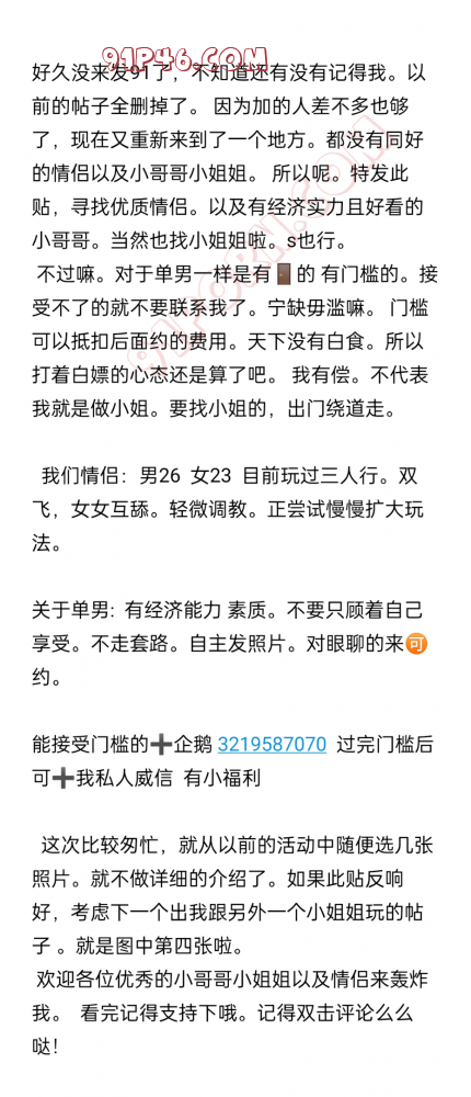 好久没来发91了,不知道还有没有记得我。以前的帖子全删掉了。 因为加的人差不多也够了,现在又重新来到了一个地方。都没有同好的情侣以及小哥哥小姐姐。 所以呢。特发此贴,寻找优质情侣。以及有经济实力且好看的小哥哥。当然也找小姐姐啦。s也行。